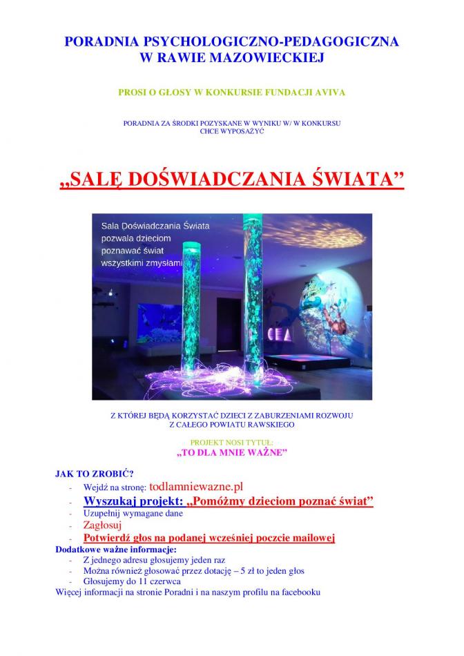 Świat jest barwny i ciekawy. Sprawmy, żeby dzieci - podopieczni Poradni Psychologiczno -Pedagogicznej - mogły się o tym przekonać. Jest szansa na utworzenie sali doświadczania świata - potrzebny jest tylko głos każdego z nas, oddany w konkursie "To dla mnie ważne". Rawski projekt nosi nazwę "Pomóżmy dzieciom poznać świat". Głosowanie trwa do 11 czerwca http://todlamniewazne.pl/inicjatywa,1289,pomoacutezmy-dziec. Szczegóły znajdują się na załączonym plakacie.