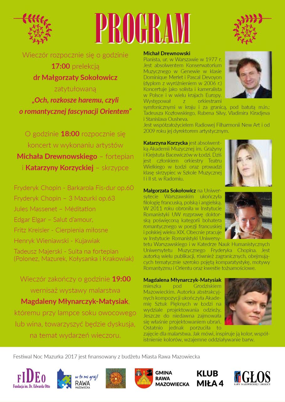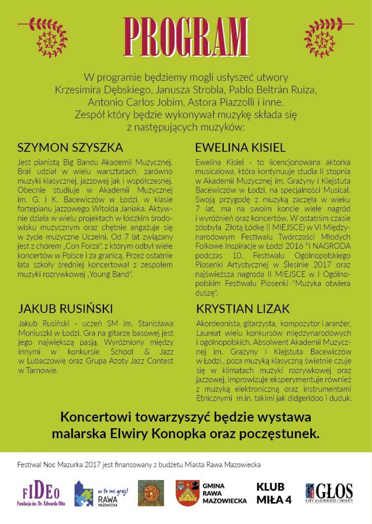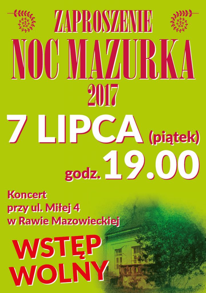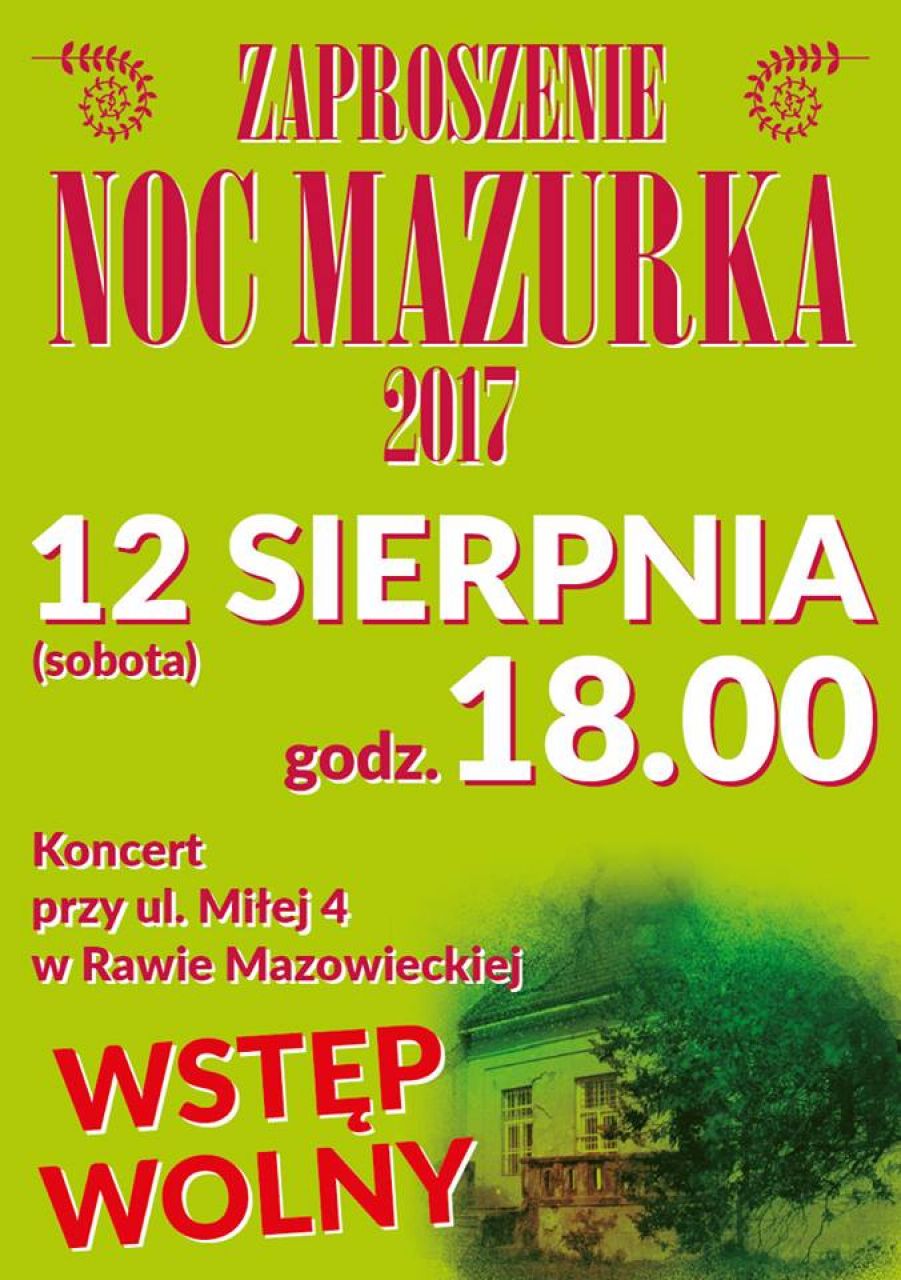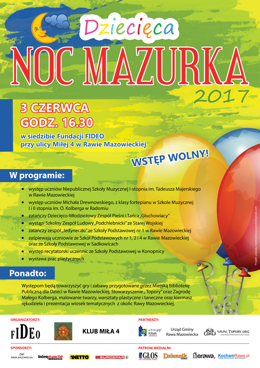 3 czerwca w siedzibie Fundacji FIDEO przy ulicy Miłej 4 odbędzie się Dziecięca Noc Mazurka. Wydarzenie rozpoczyna się o godz. 16.30. Organizatorami Dziecięcej Nocy Mazurka są Fundacja Fideo i Klub Miła 4, a partnerem wydarzenia jest Miasto Rawa Mazowiecka. Zapraszamy.