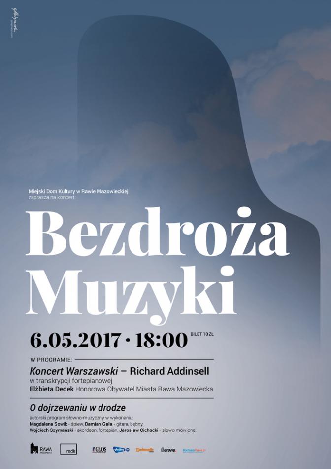 „Bezdroża muzyki” to koncert jakiego jeszcze nie było - zderzenie dwóch muzycznych światów, wrażliwości i życiowych doświadczeń. Dwie opowieści, a każda z nich przeniesie nas w inny wymiar kojących brzmień. Pierwsza odsłona tej muzycznej uczty to recital pani Elżbiety Dedek, która zaprezentuje rawskiej publiczności ścieżkę dźwiękową autorstwa Richarda Addinsella do filmu z roku 1941 pt. „Niebezpieczne światło księżyca”, a nosi ona tytuł „Koncert Warszawski”.
