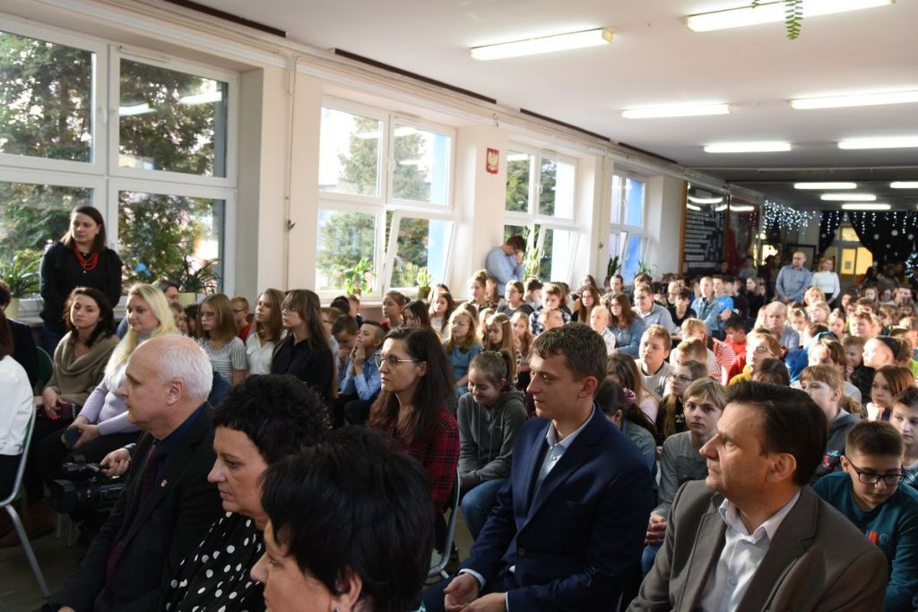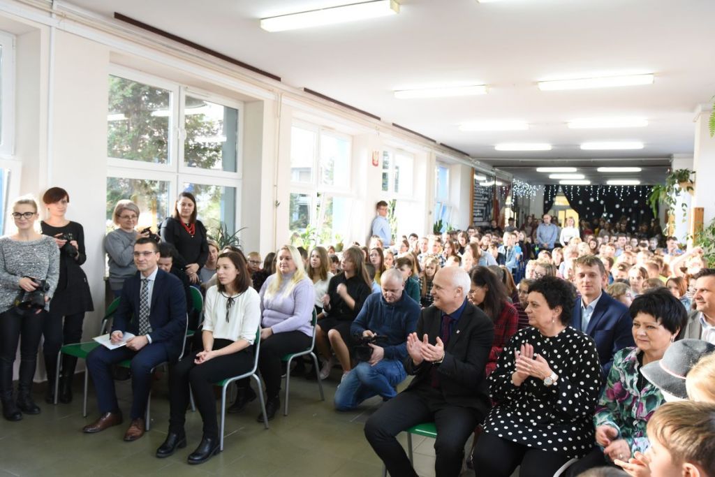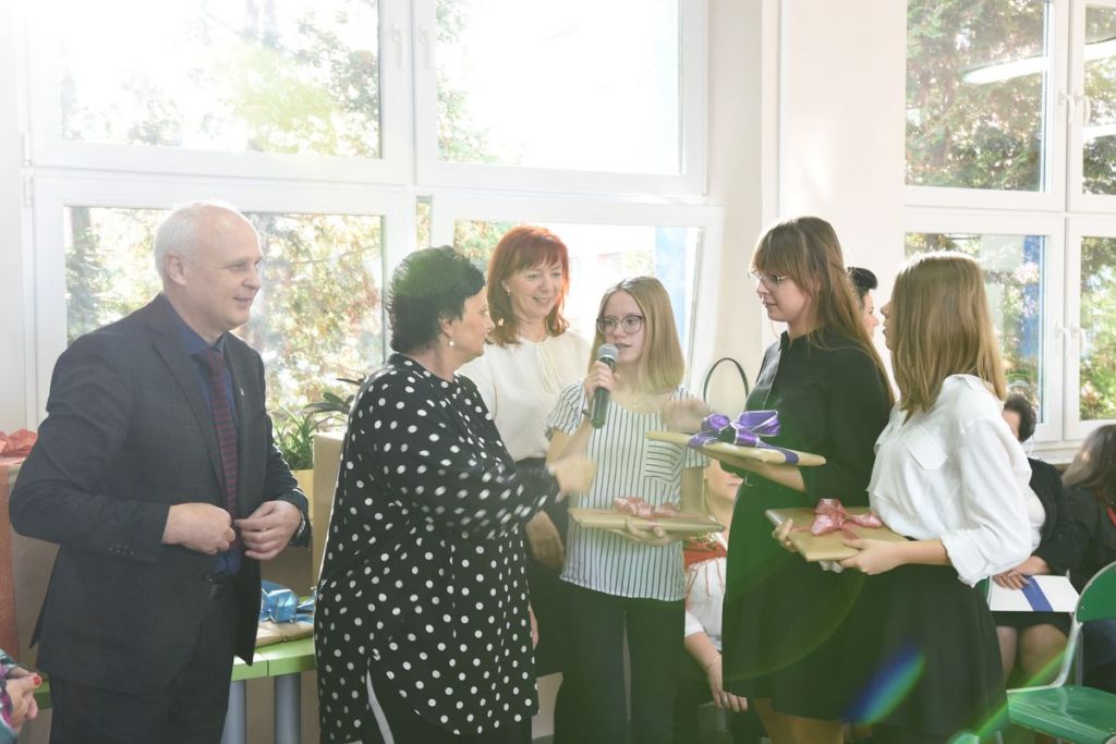 Po oficjalnych podziękowaniach nastąpiło podpisanie protokołu przekazania zakupionych komputerów na rzecz szkoły. Protokół podpisał w imieniu miasta jego włodarz Pan Piotr Irla, a w imieniu szkoły Pani Dyrektor Irena Wiśniewska. Następnie komputery zostały przekazane przez władze miasta na ręce uczniów z samorządu uczniowskiego.
