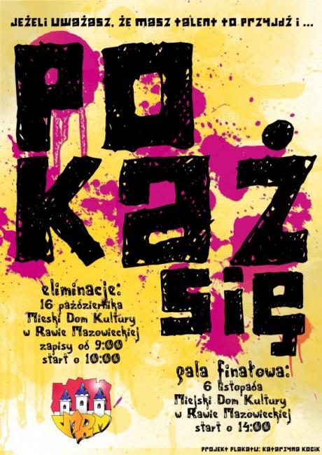 Młodzieżowa Rada Miasta Rawa Mazowiecka po raz pierwszy zaprasza do udziału w niezwykłym konkursie pn. "POKAŻ SIĘ". Celem konkursu jest zaprezentowanie i promocja talentów na scenie Miejskiego Domu Kultury w Rawie Mazowieckiej. Konkurs będzie składał się z dwóch etapów: eliminacji i finału.