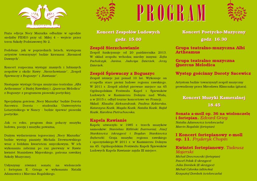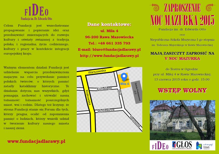 Fundacja im. Dr Edwarda Otto zaprasza na piątą edycję "Nocy Mazurka", która odbędzie się w sobotę 13. czerwca w ogrodzie przy ul. Miłej 4 w Rawie Mazowieckiej