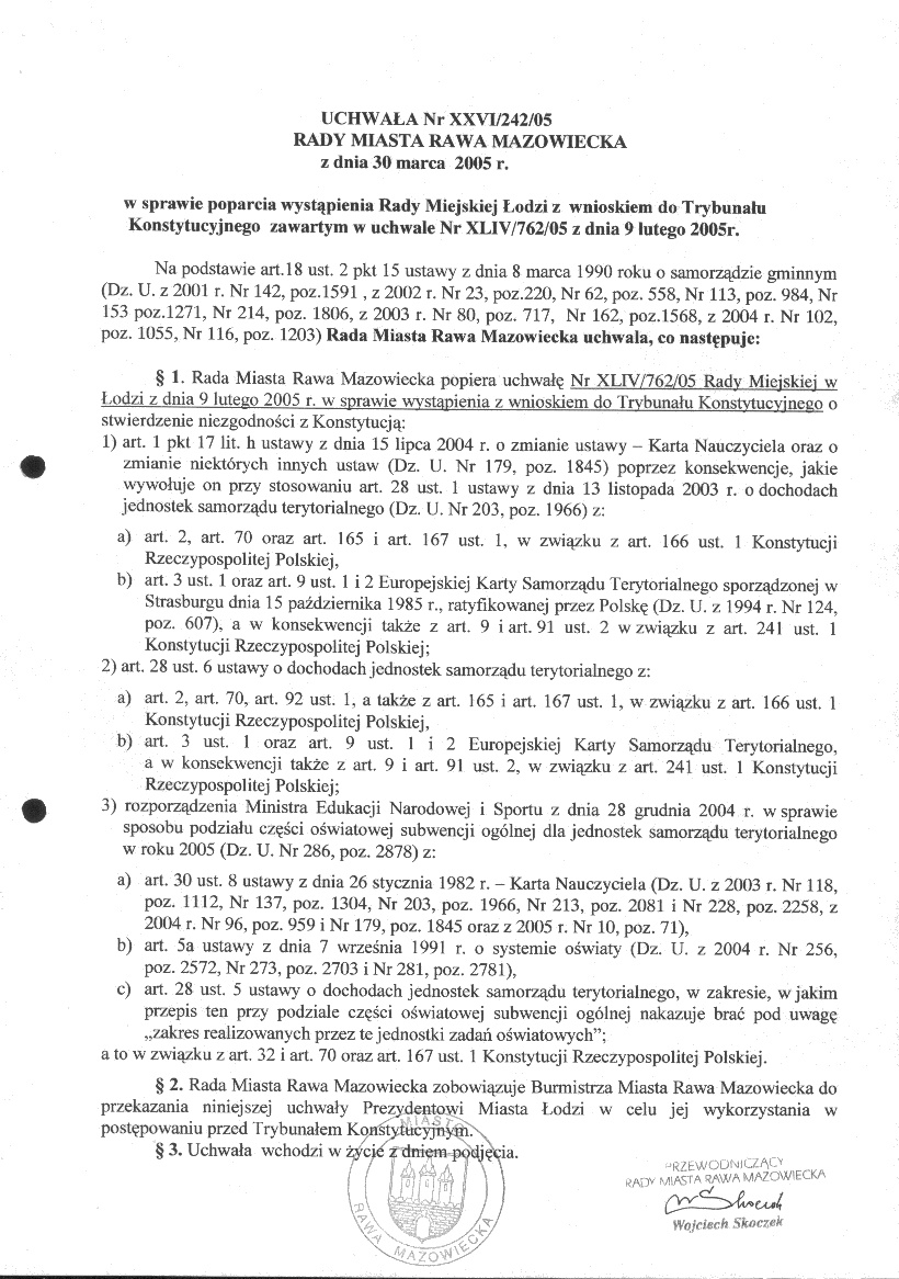 UCHWAŁA NR XXVI/242/05 z dnia 30 marca 2005 r. w sprawie poparcia wystąpienia Rady Miejskiej Łodzi do Trybunału Konstytucyjnego zawartym w uchwale Nr XLIV/762/05 z dnia 9 lutego 2005 r.