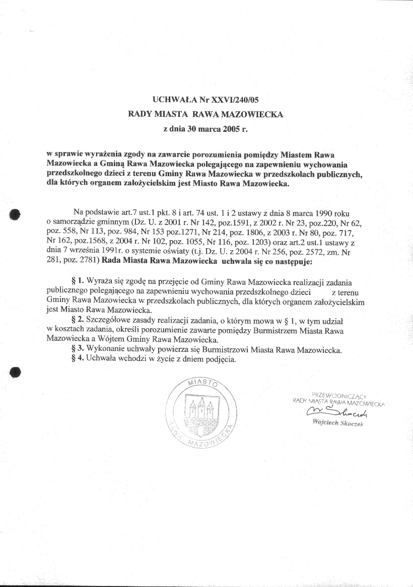 UCHWAŁA NR XXVI/240/05 z dnia 30 marca 2005 r. w sprawie wyrażenia zgody na zawarcie porozumienia pomiędzy Miastem Rawa Mazowiecka a Gminą Rawa Mazowiecka polegającego na zapewnieniu wychowania przedszkolnego dzieci z terenu Gminy w przedszkolach publ...