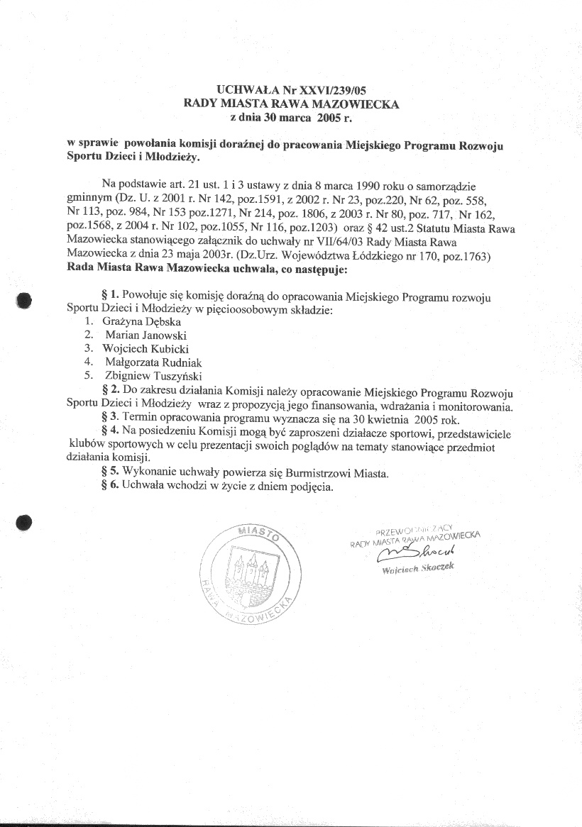 UCHWAŁA NR XXVI/239/05 z dnia 30 marca 2005 r. w sprawie powołania komisji doraźnej do opracowania Miejskiego Programu Rozwoju Sportu Dzieci i Młodzieży