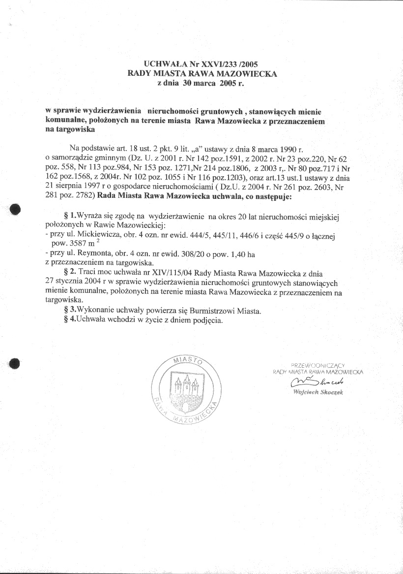 UCHWAŁA NR XXVI/233/05 z dnia 30 marca 2005 r. w sprawie wydzierżawienia nieruchomości gruntowych, stanowiących mienie komunalne, położonych na terenie miasta Rawa Mazowiecka z przeznaczeniem na targowiska