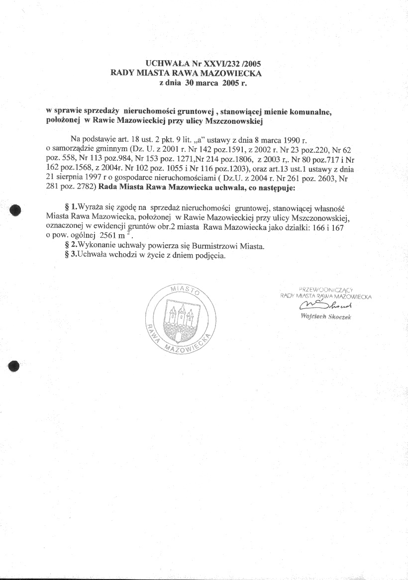 UCHWAŁA NR XXVI/232/05 z dnia 30 marca 2005 r. w sprawie sprzedaży nieruchomości gruntowej, stanowiącej mienie komunalne, położonej w Rawie Mazowieckiej przy ulicy Mszczonowskiej