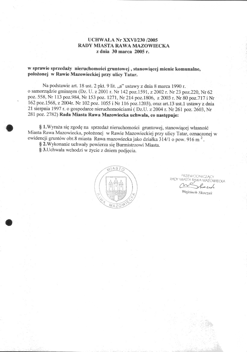 UCHWAŁA NR XXVI/230/05 z dnia 30 marca 2005 r. w sprawie sprzedaży nieruchomości gruntowej, stanowiącej mienie komunalne, położonej w Rawie Mazowieckiej przy ulicy Tatar