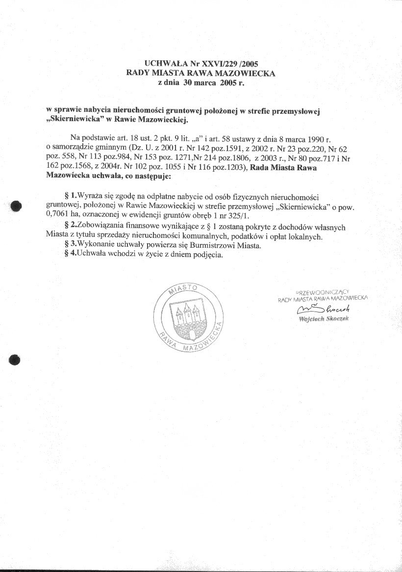 UCHWAŁA NR XXVI/229/05 z dnia 30 marca 2005 r. w sprawie nabycia nieruchomości gruntowej położonej w strefie przemysłowej "Skierniewicka" w Rawie Mazowieckiej