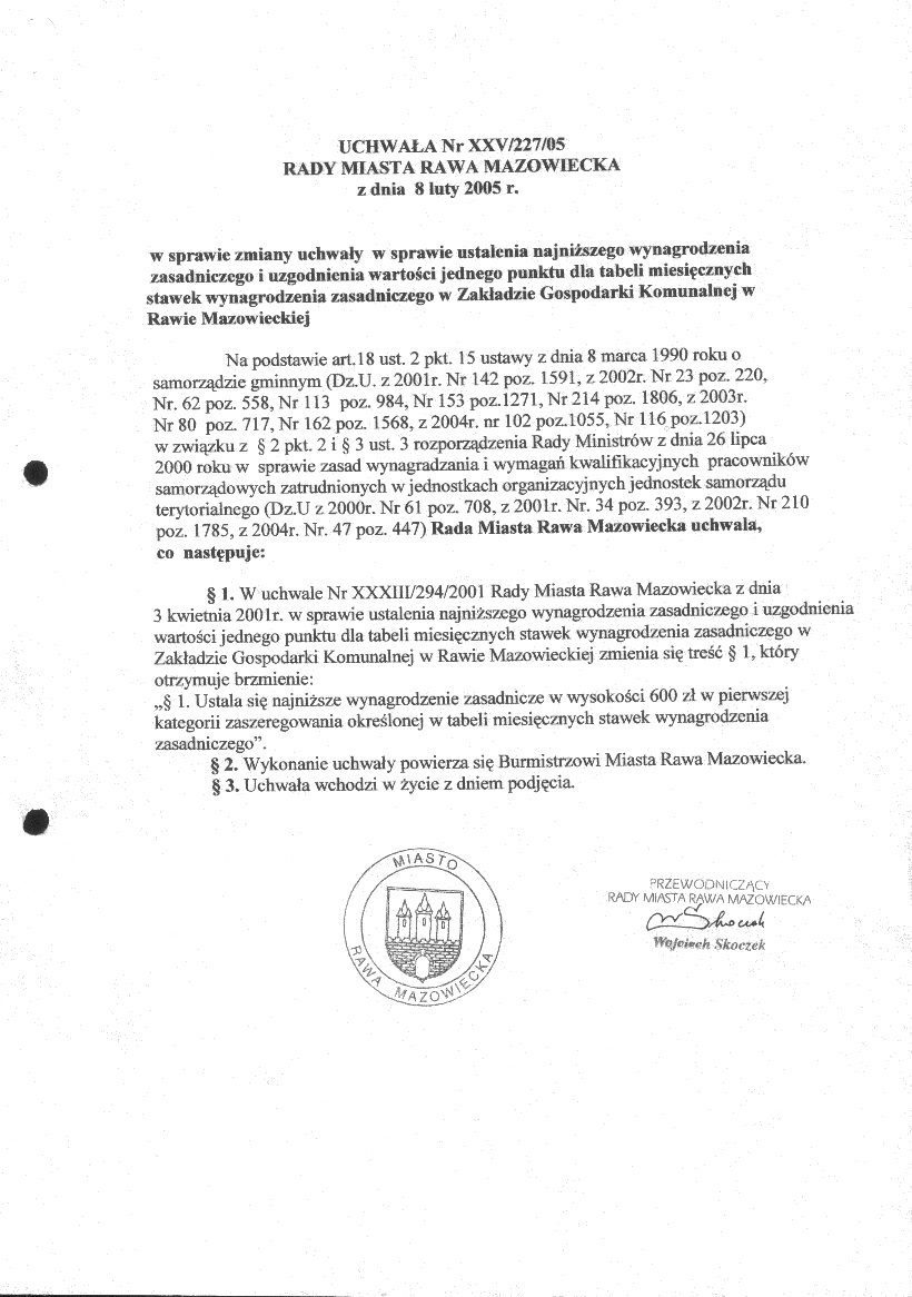 UCHWAŁA NR XXV/227/05 z dnia 8 luty 2005 r. w sprawie zmiany uchwały sprawie ustalenia najniższego wynagrodzenia zasadniczego i uzgodnienia wartości jednego punktu dla tabeli miesięcznych stawek wynagrodzenia zasadniczego w ZGK w Rawie Mazowieckiej