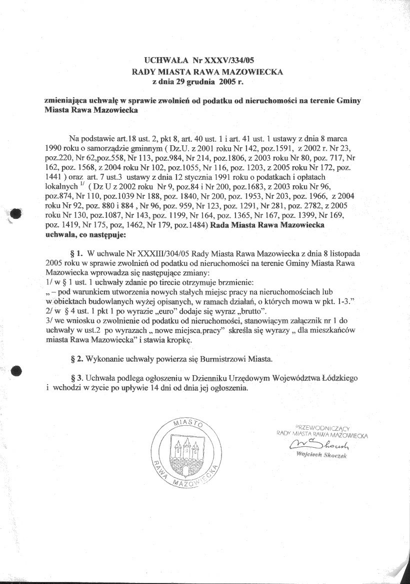 UCHWAŁA NR XXXV/334/05 z dnia 29 grudnia 2005r. zmieniająca uchwałę w sprawie zwolnień od podatku od nieruchomości na terenie Gminy Miasta Rawa Mazowiecka
