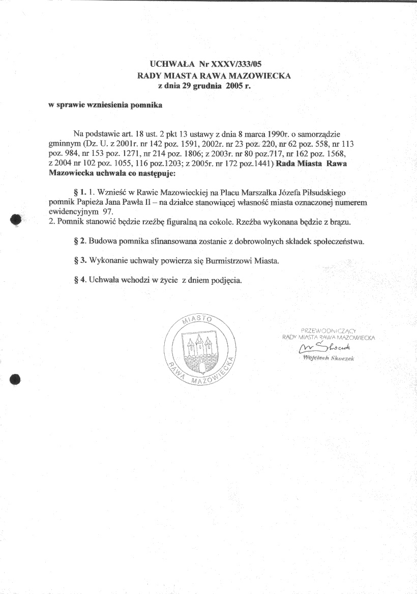 UCHWAŁA NR XXXV/333/05 z dnia 29 grudnia 2005r. w sprawie wzniesienia pomnika