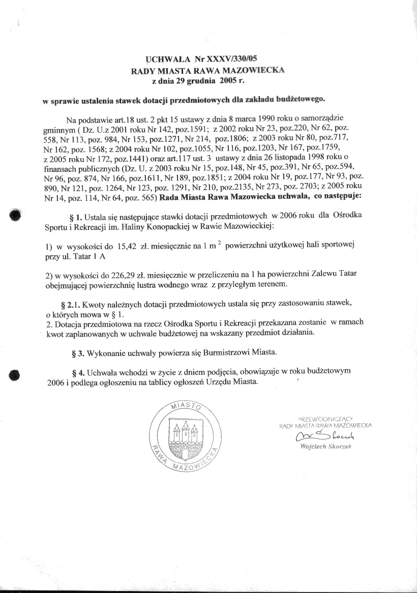 UCHWAŁA NR XXXV/330/05 z dnia 29 grudnia 2005r. w sprawie ustalenia stawek dotacji przedmiotowych dla zakładu budżetowego