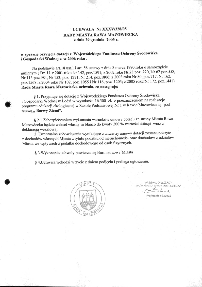 UCHWAŁA NR XXXV/328/05 z dnia 29 grudnia 2005r. w sprawie przyjęcia dotacji z Wojewódzkiego Funduszu Ochrony Środowicka i Gospodarki Wodnej w 2006 roku