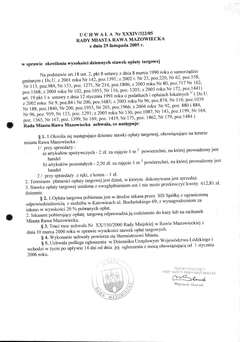 UCHWAŁA NR XXXIV/322/05 z dnia 29 listopada 2005r. w sprawie określenia wysokości dziennych stawek oplaty targowej