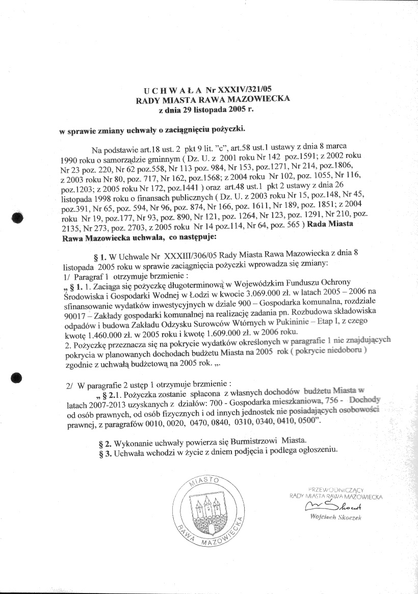 UCHWAŁA NR XXXIV/321/05 z dnia 29 listopada 2005r. w sprawie zmiany uchwały o zaciągnięciu pożyczki