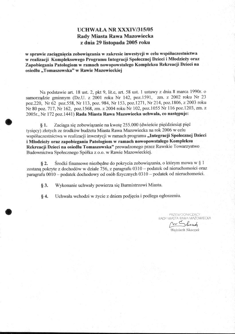 UCHWAŁA NR XXXIV/315/05 z dnia 29 listopada 2005r. w sprawie zaciągnięcia zobowiązania w zakresie inwestycji w celu współuczestnictwa w realizacji Kompleksowego Programu Integracji Społecznej Dzieci i Młodzieży oraz Zapobiegania Patologiom....