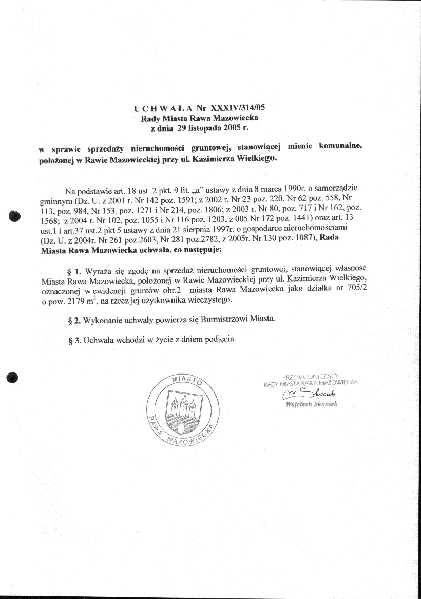 UCHWAŁA NR XXXIV/314/05 z dnia 29 listopada 2005r. w sprawie sprzedaży nieruchomości gruntowej, stanowiącej mienie komunalne, położonej w Rawie Mazowieckiej przy ul. Kazimierza Wielkiego