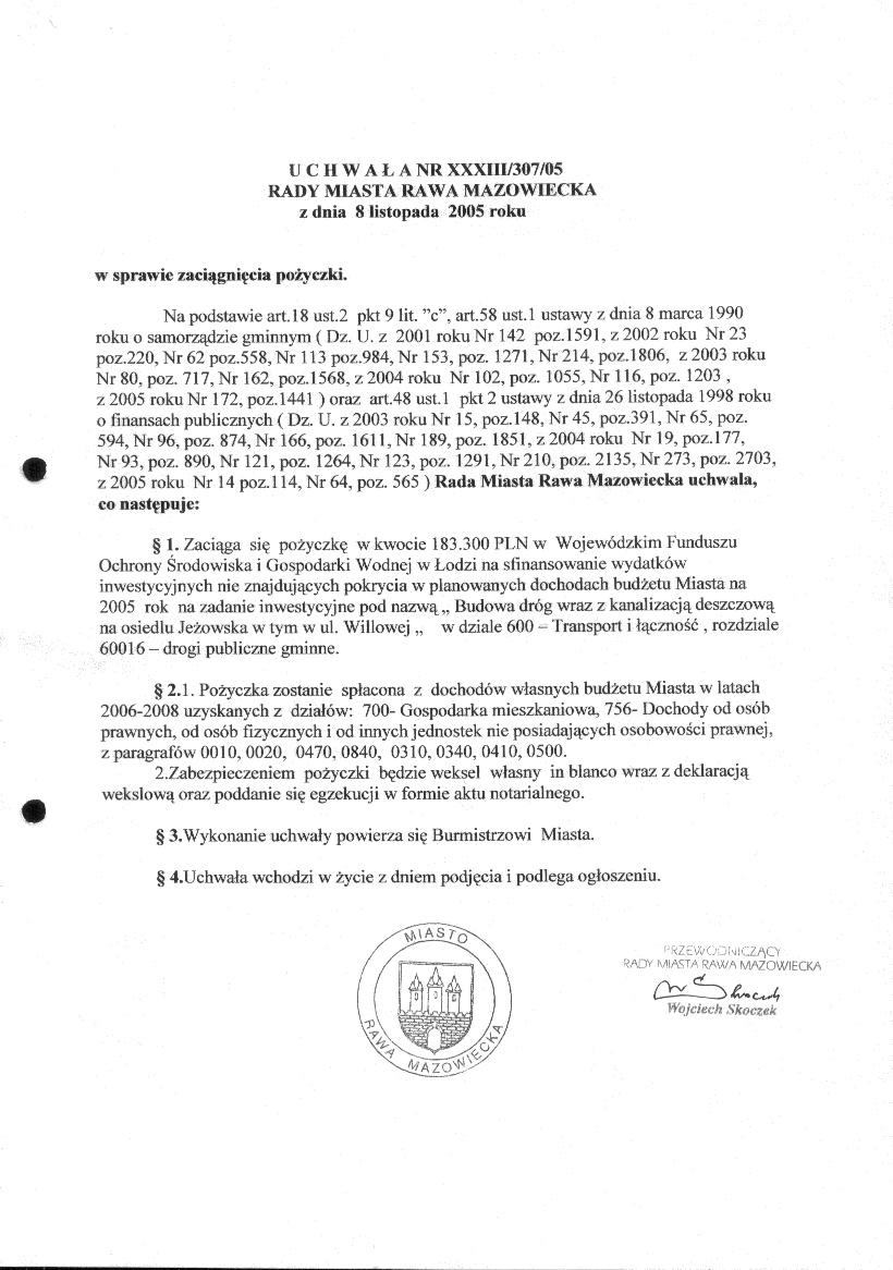 UCHWAŁA NR XXXIII/307/05 z dnia 8 listopada 2005r. w sprawie zaciągnięcia pożyczki