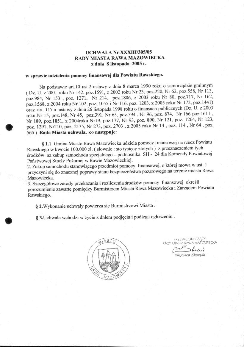 UCHWAŁA NR XXXIII/305/05 z dnia 8 listopada 2005r. w sprawie udzielenia pomocy finansowej dla Powiatu Rawskiego