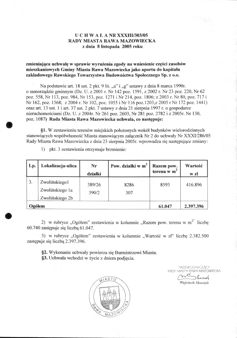 UCHWAŁA NR XXXIII/303/05 z dnia 8 listopada 2005r. zmieniająca uchwałę w sprawie wyrażenia zgody na wniesienie części zasobów mieszkaniowych Gminy Miasta Rawa Mazowiecka jako aportu do kapitału zakładowego Rawskiego Towarzystwa Budownictwa Społeczego