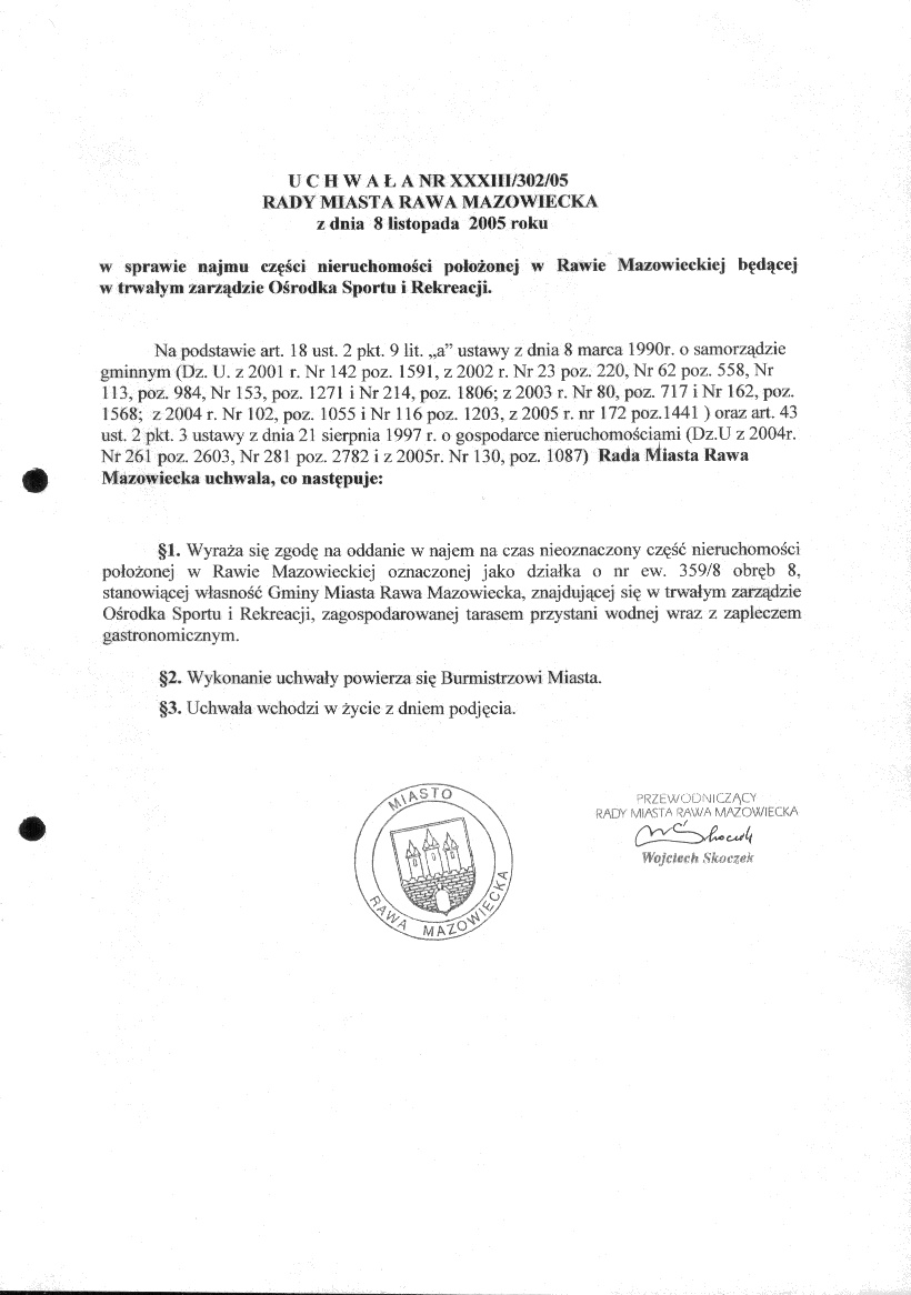 UCHWAŁA NR XXXIII/302/05 z dnia 8 listopada 2005r. w sprawie najmu części nieruchomości położonej w Rawie Mazowieckiej będącej w trwałym zarządzie Ośrodka Sportu i Rekreacji