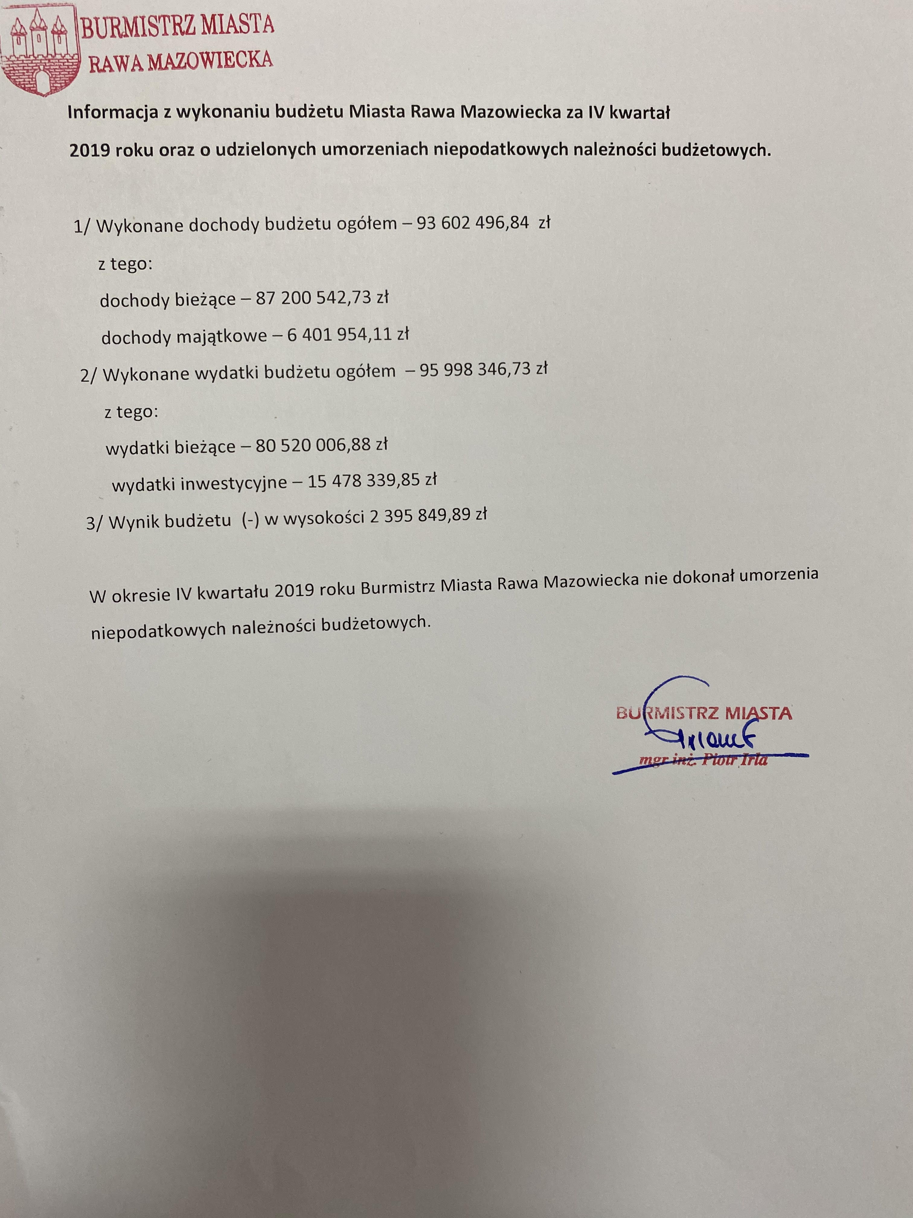 Informacja z wykonania budżetu Miasta Rawa Mazowiecka za IV kwartał 2019 roku o udzielonych umorzeniach nieopodatkowanych należności budżetowych .