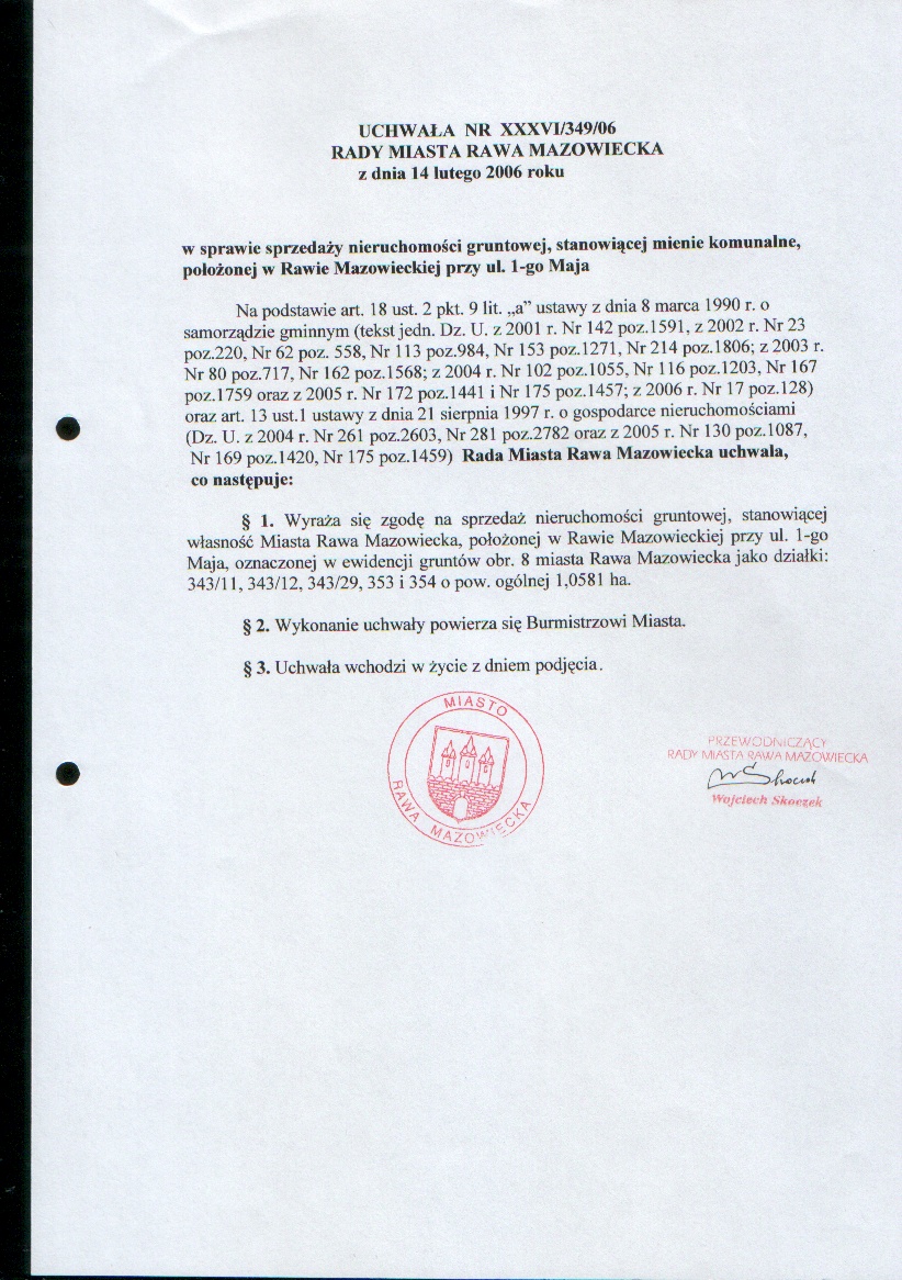 UCHWAŁA NR XXXVI/349/06 z dnia 14 lutego 2006 r. w sprawie sprzedaży nieruchomości gruntowej, stanowiącej mienie komunalne, położonej w Rawie Mazowieckiej przy ul.1-go Maja