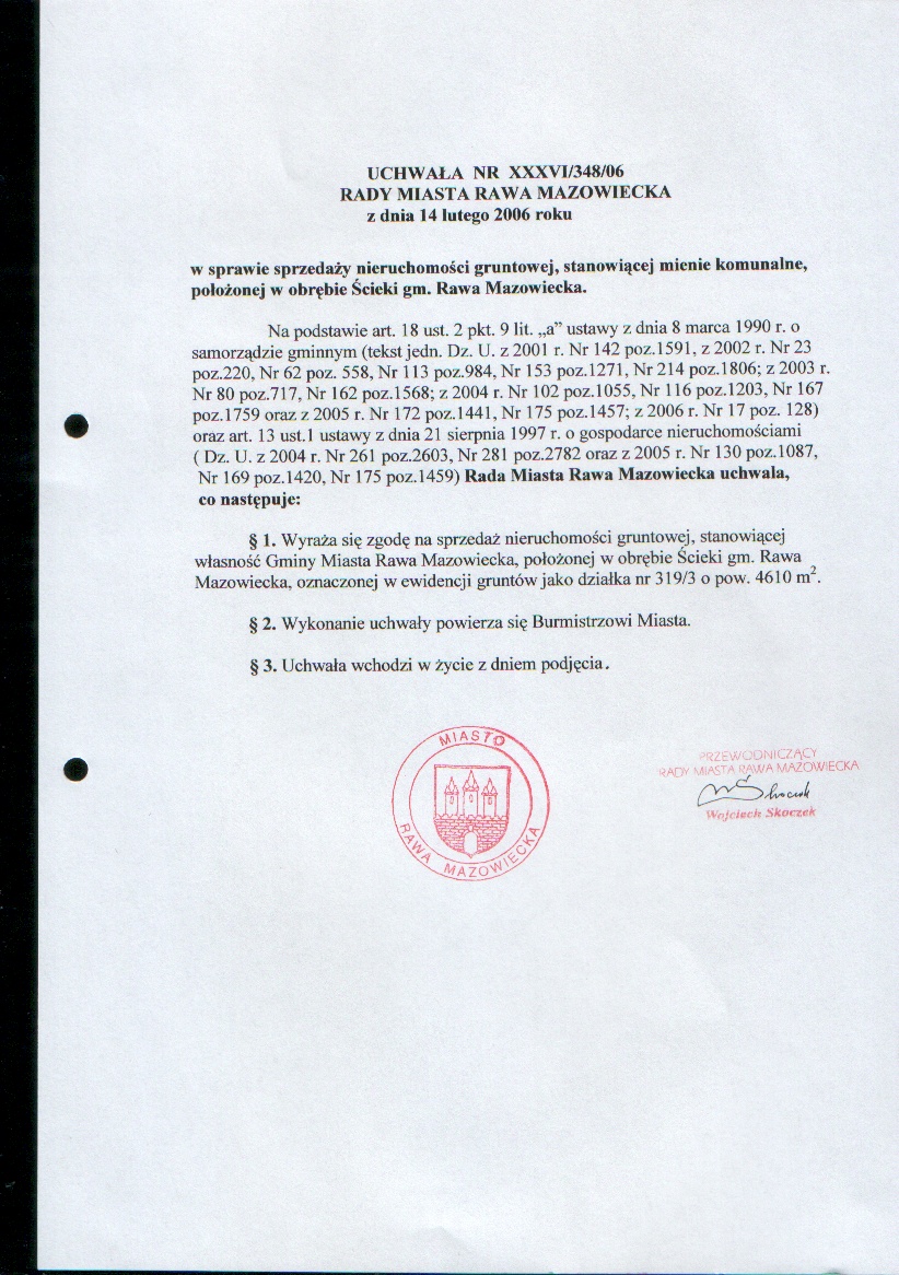 UCHWAŁA NR XXXVI/348/06 z dnia 14 lutego 2006 r. w sprawie sprzedaży nieruchomości gruntowej, stanowiącej mienie komunalne, położonej w obrębie Ścieki gm. Rawa Mazowiecka