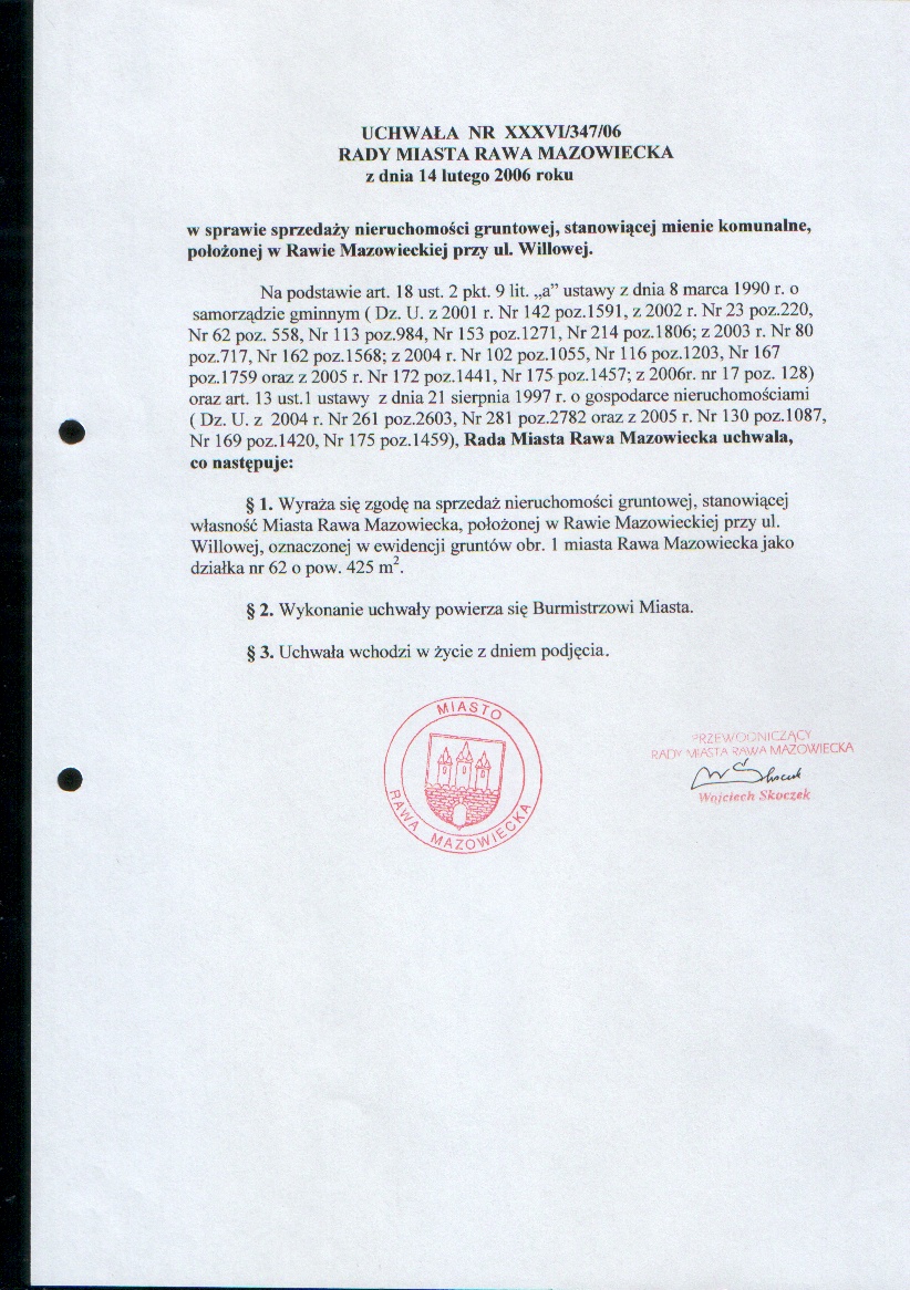 UCHWAŁA NR XXXVI/347/06 z dnia 14 lutego 2006 r. w sprawie sprzedaży nieruchomości gruntowej , stanowiącej mienie komunalne, położonej w Rawie Mazowieckiej przy ul. Willowej