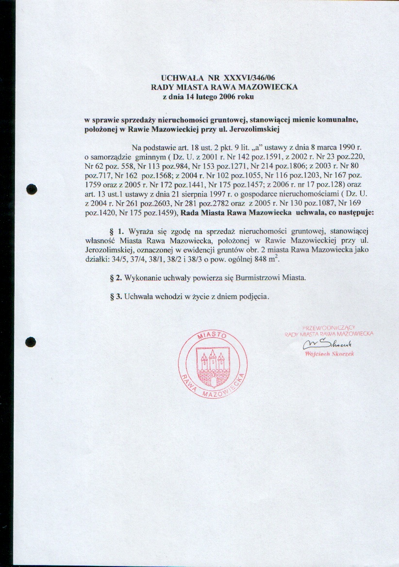 UCHWAŁA NR XXXVI/346/06 z dnia 14 lutego 2006 r. w sprawie sprzedaży nieruchomości gruntowej,stanowiącej mienie komunalne,położonej w Rawie Mazowieckiej przy ulicy Jerozolimskiej