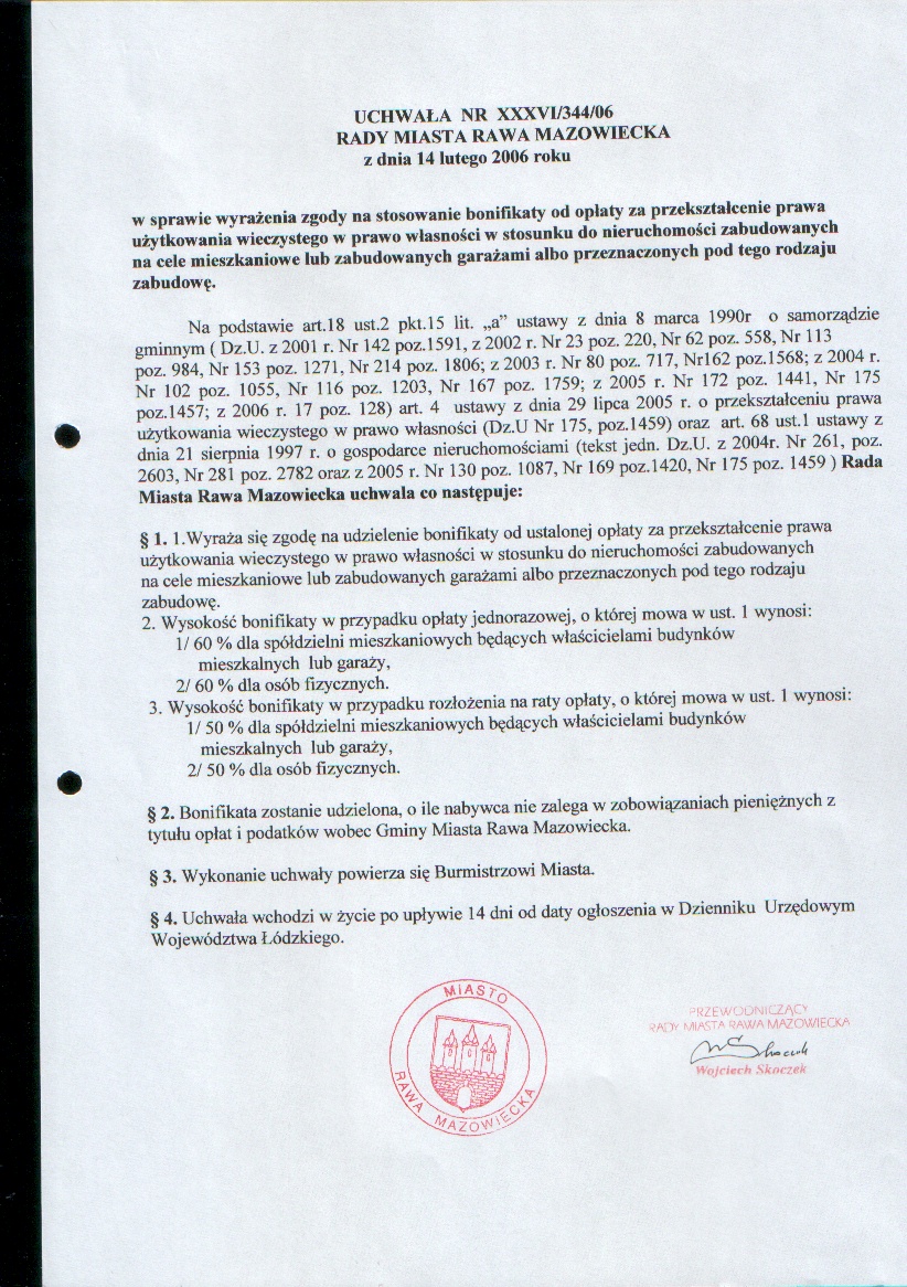 UCHWAŁA NR XXXVI/344/06 z dnia 14 lutego 2006 r. w sprawie wyrażenia zgody na stosowanie bonifikaty od opłaty za przekształcenie prawa użytkowania wieczystego w prawo własności w stosunku do nieruchomości zabudowanych na cele mieszkaniowe...