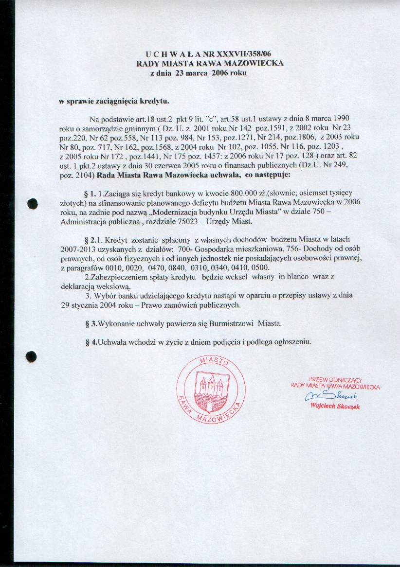 UCHWAŁA NR XXXVII/358/06 z dnia 23 marca 2006 r. w sprawie zaciągnięcia kredytu