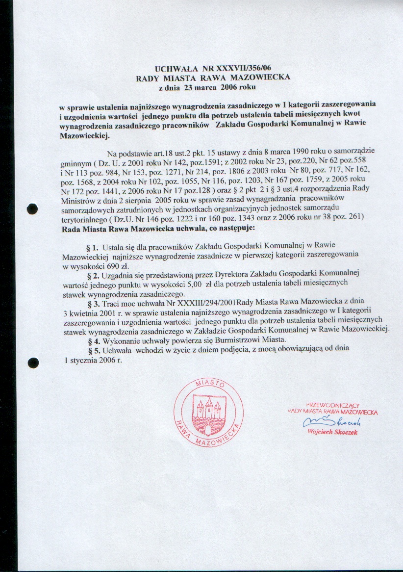 UCHWAŁA NR XXXVII/356/06 z dnia 23 marca 2006 r. w sprawie ustalenia najniższego wynagrodzenia zasadniczego w I kategorii zaszeregowania i uzgodnienia wartości jednego punktu dla potrzeb ustalenia tabeli miesięcznych kwot wynagrodzenia zasadniczego ZGK...