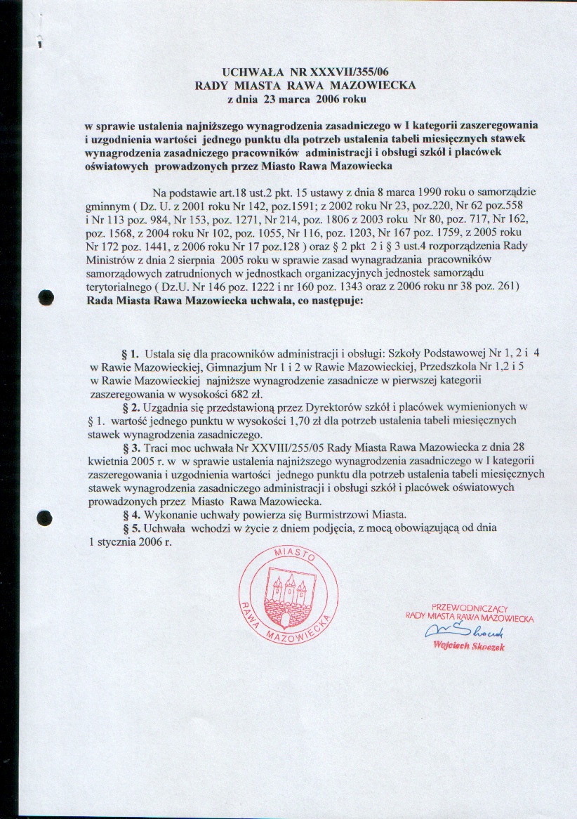 UCHWAŁA NR XXXVII/355/06 z dnia 23 marca 2006 r. w sprawie ustalenia najniższego wynagrodzenia zasadniczego w I kategorii zaszeregowania i uzgodnienia wartości jednego punktu dla potrzeb ustalenia tabeli miesięcznych stawek wynagrodzenia...