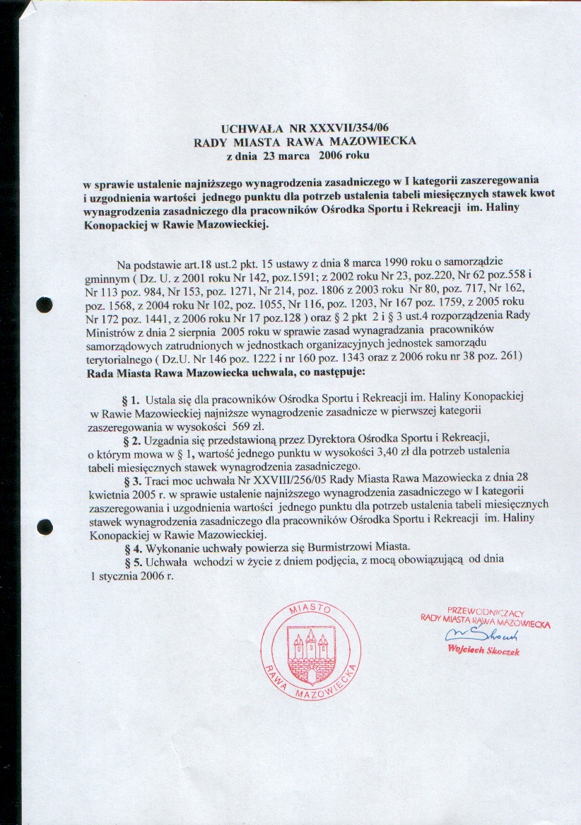 UCHWAŁA NR XXXVII/354/06 z dnia 23 marca 2006 r. w sprawie ustalenia najniższego wynagrodzenia zasadniczego w I kategorii zaszeregowania i uzgodnienia wartości jednego punktu dla potrzeb ustalenia tabeli miesięcznych stawek kwot wynagrodzenia...
