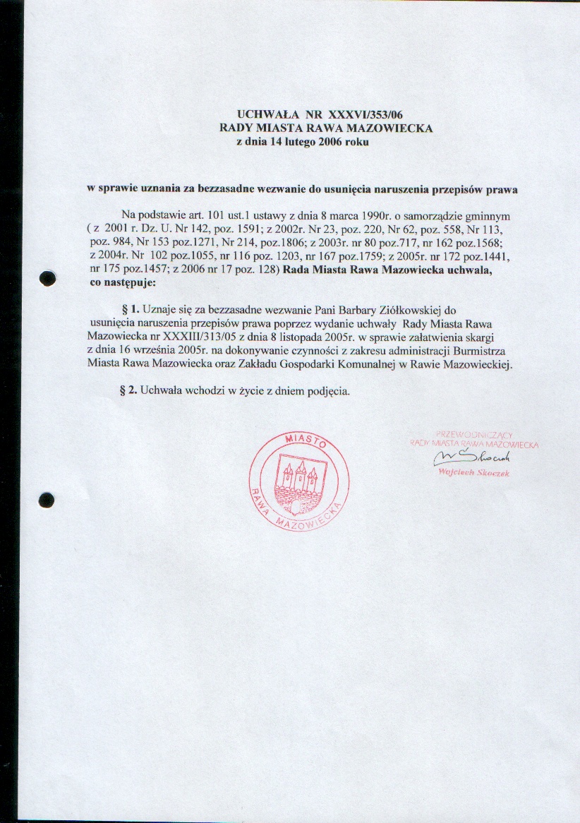 UCHWAŁA NR XXXVI/353/06 z dnia 14 lutego 2006 r. w sprawie uznania za bezzasadne wezwanie do usunięcia naruszenia przepisów prawa