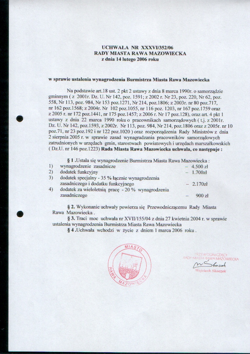 UCHWAŁA NR XXXVI/352/06 z dnia 14 lutego 2006 r. w sprawie ustalenia wynagrodzenia Burmistrza Miasta Rawa Mazowiecka