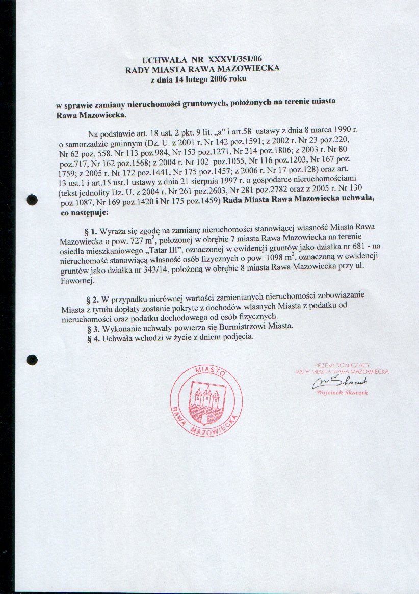 UCHWAŁA NR XXXVI/351/06 z dnia 14 lutego 2006 r. w sprawie zamiany nieruchomości gruntowych, położonych na terenie miasta Rawa Mazowiecka