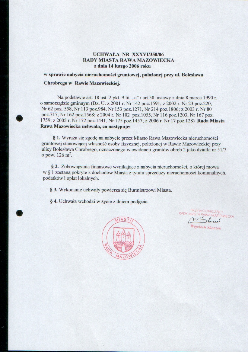 UCHWAŁA NR XXXVI/350/06 z dnia 14 lutego 2006 r. w sprawie nabycia nieruchomości gruntowej, położonej przy ul. Bolesława Chrobrego w Rawie Mazowieckiej