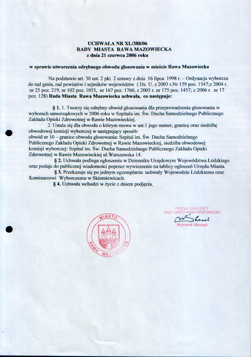 UCHWAŁA NR XL/388/06 z dnia 21 czerwca 2006 r. w sprawie utworzenia odrębnego obwodu głosowania w mieście Rawa Mazowiecka