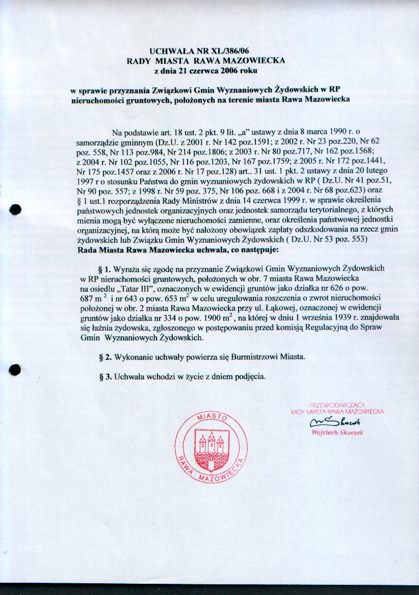UCHWAŁA NR XL/386/06 z dnia 21 czerwca 2006 r. w sprawie przyznania Związkowi Gmin Żydowskich w RP nieruchomości gruntowych, położonych na terenie miasta Rawa Mazowiecka