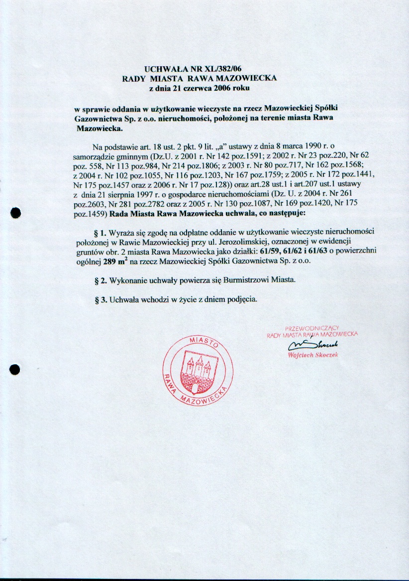 UCHWAŁA NR XL/382/06 z dnia 21 czerwca 2006 r. w sprawie oddania w użytkowanie wieczyste na rzecz Mazowieckiej Spółki Gazownictwa Sp.zo.o. nieruchomości, położonej na terenie Miasta Rawa Mazowiecka