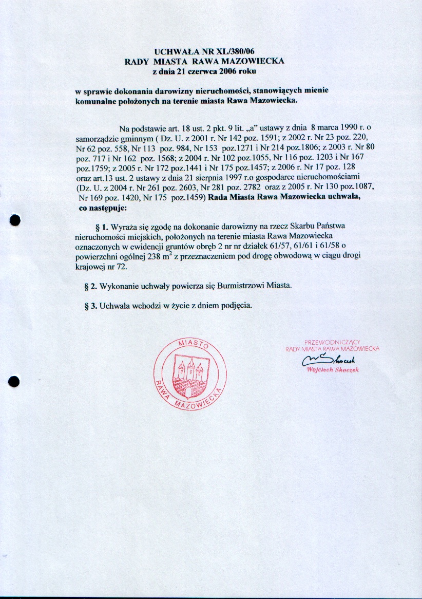 UCHWAŁA NR XL/380/06 z dnia 21 czerwca 2006 r. w sprawie dokonania darowizny nieruchomości, stanowiących mienie komunalne położonych na terenie miasta Rawa Mazowiecka