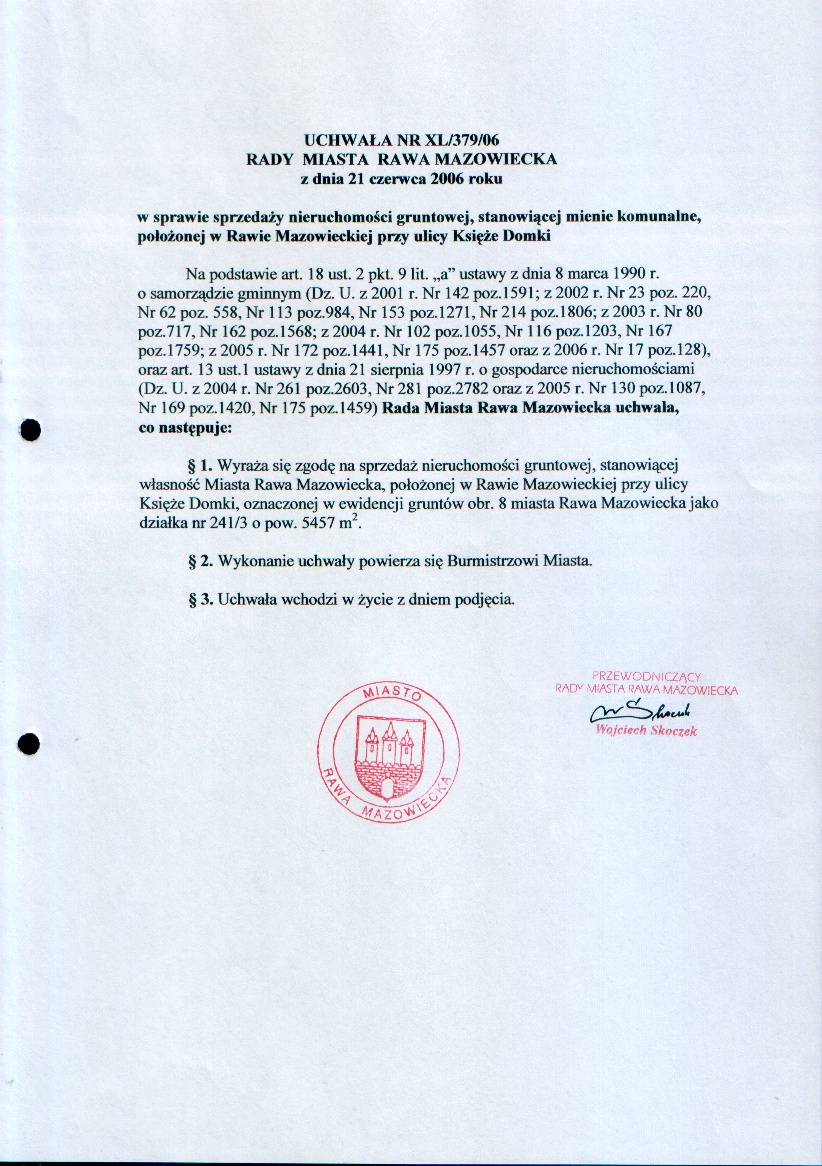 UCHWAŁA NR XL/379/06 z dnia 21 czerwca 2006 r. w sprawie sprzedaży nieruchomości gruntoej, stanowiącej mienie komunalne, polożonej w Rawie Mazowieckiej przy ulicy Księże Domki