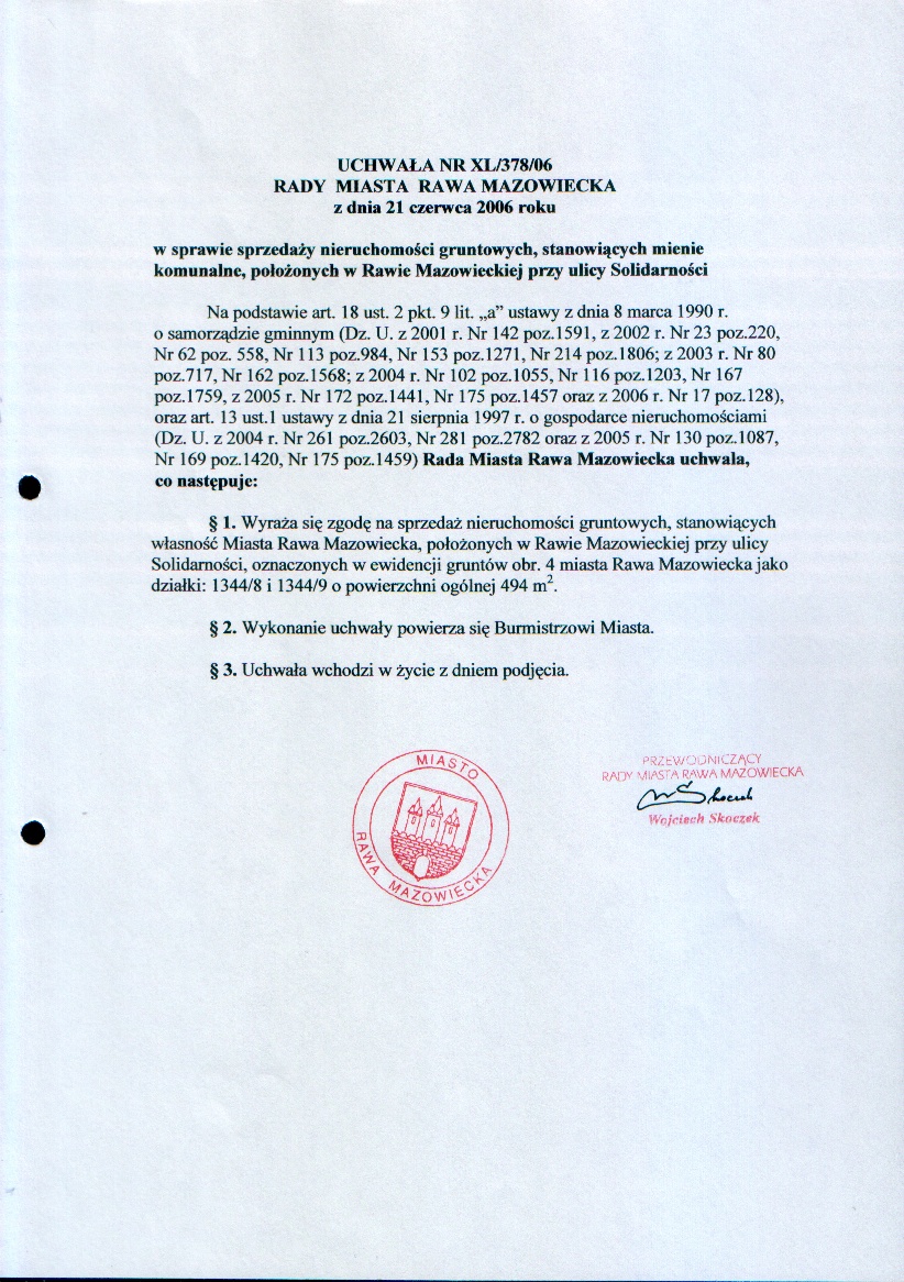 UCHWAŁA NR XL/378/06 z dnia 21 czerwca 2006 r. w sprawie sprzedaży nieruchomości gruntowych, stanowiących mienie komunalne, położonych w Rawie Mazowieckiej przy ulicy Solidarności
