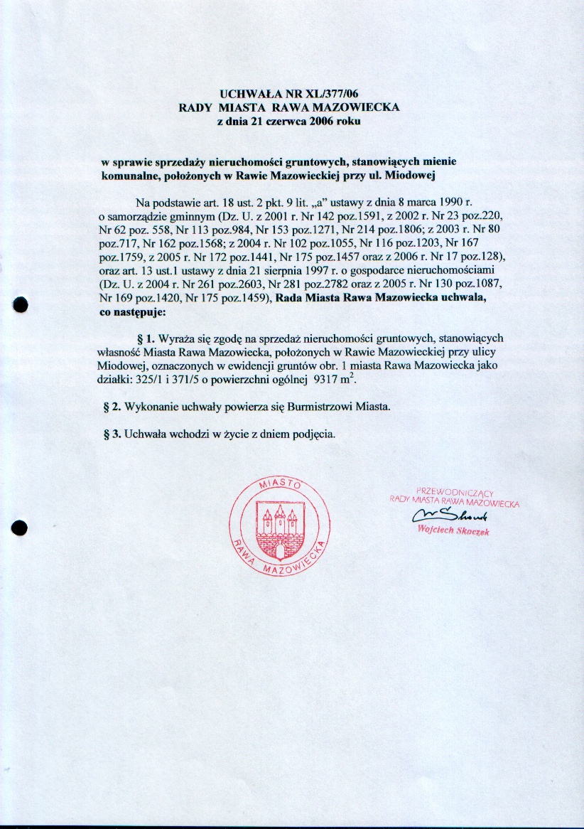 UCHWAŁA NR XL/377/06 z dnia 21 czerwca 2006 r. w sprawie sprzedaży nieruchomości, stanowiących mienie komunalne, położonych w Rawie Mazowieckiej przy ul. Miodowej