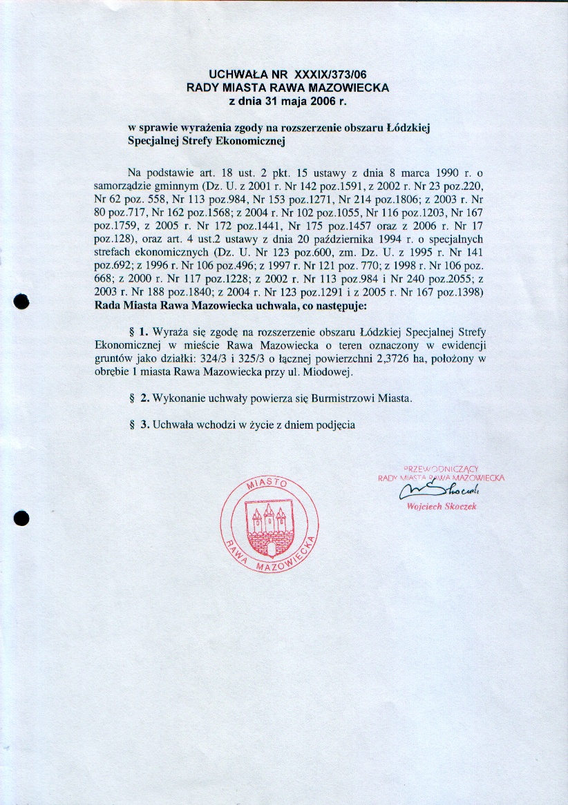 UCHWAŁA NR XXXIX/373/06 z dnia 31 maja 2006 r. w sprawie wyrażenia zgody na rozszerzenie obszaru Łódzkiej Specjalnej Strefy Ekonomicznej