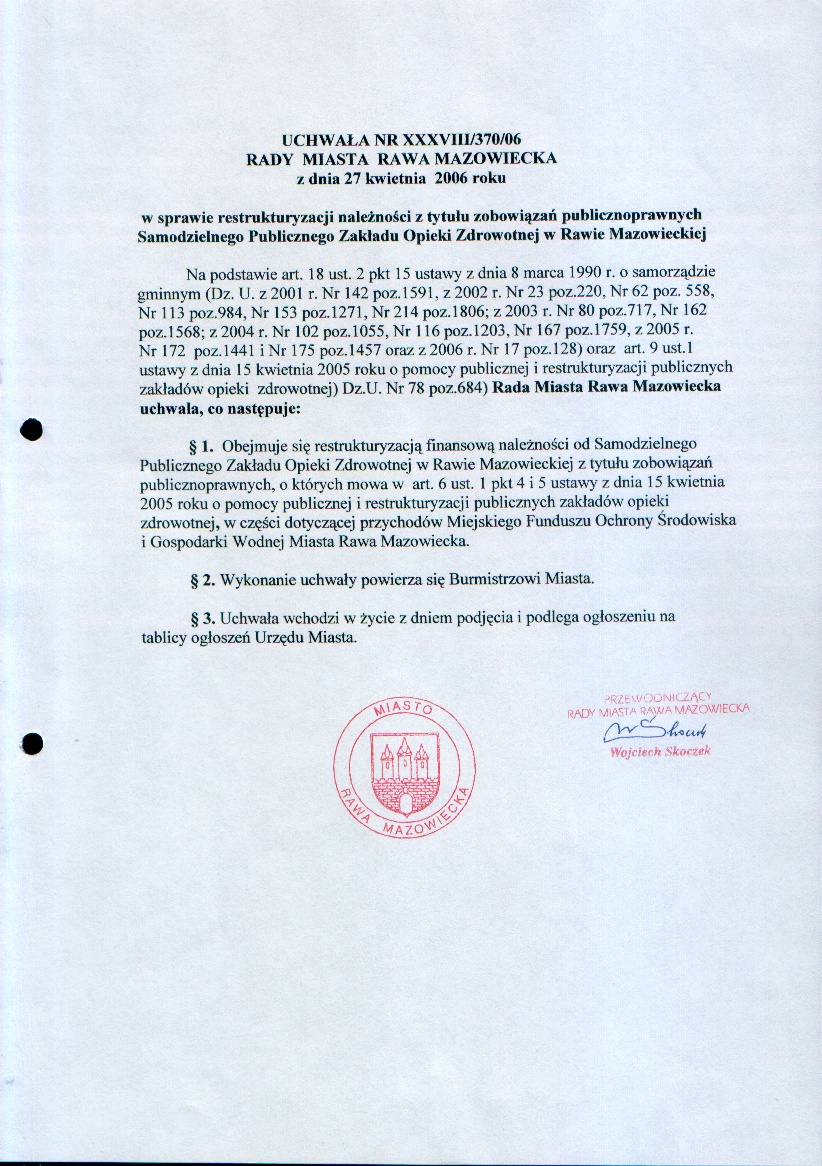 UCHWAŁA NR XXXVIII/370/06 z dnia 27 kwietnia 2006 r. w sprawie restrukturyzacji należności z tytułu zobowiązań publicznoprawnych Samodzielnego Publicznego Zakładu Opieki Zdrowotnej w Rawie Mazowieckiej