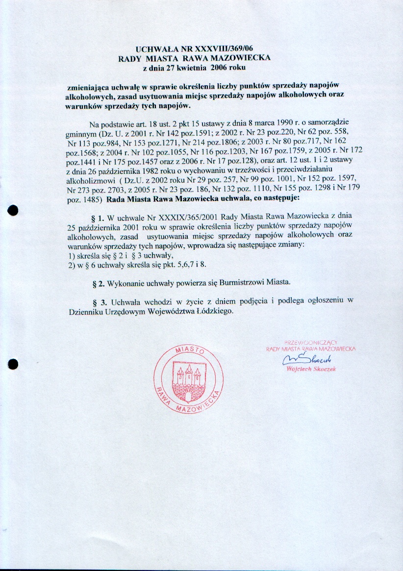 UCHWAŁA NR XXXVIII/369/06 z dnia 27 kwietnia 2006 r. zmieniająca uchwałę w sprawie określenia liczby punktów sprzedaży napojów alkoholowych, zasad usytuowania miejsc sprzedaży napojów alkoholowych oraz warunków sprzedaży tych napojów